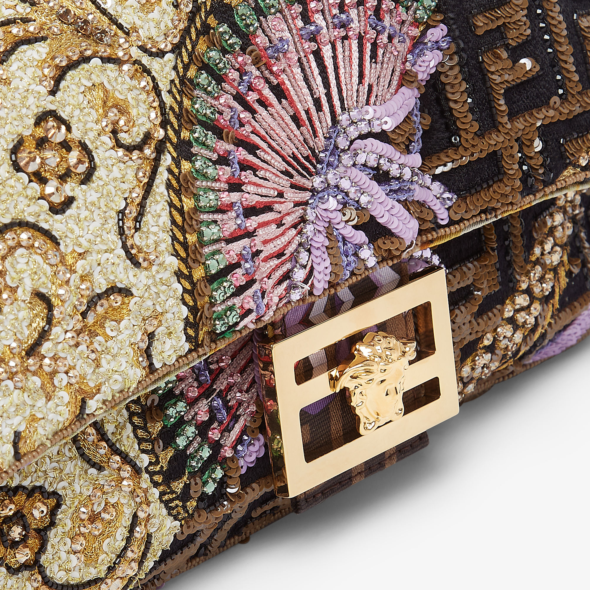 Baguette Fendace Quilted multicolour silk bag cỡ vừa mang tính biểu tượng. Được làm bằng lụa nhiều màu có đệm, chần bông, được trang trí bằng sợi thêu tinh xảo, móc siêu nhỏ và đính ngọc trai và pha lê. Các thiết kế đồ họa của Versace by Fendi kết hợp biểu tượng Fendi FF mang tính biểu tượng. Với hình in Versace Ventagli Fan. FF đóng với plexiglass màu trắng và chi tiết Medusa.