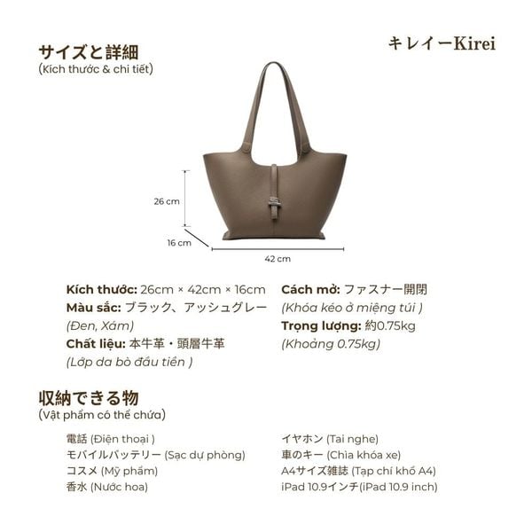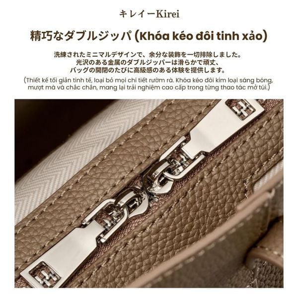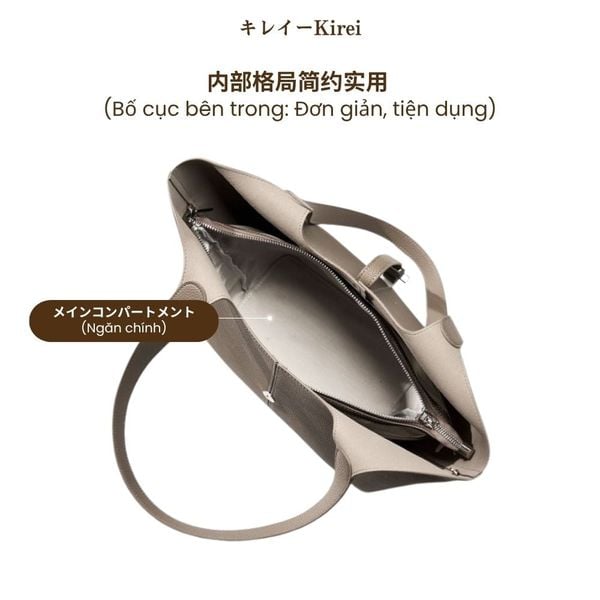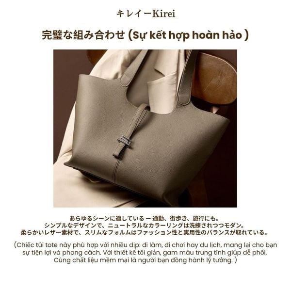 Chiếc túi tote Kirei Yugen được làm từ da bò hai lớp cao cấp, mềm mại mà vẫn giữ dáng vững vàng. Từng đường may tinh tế, form túi tối giản nhưng sang trọng, tạo nên vẻ thanh lịch tự nhiên trong từng chuyển động của người phụ nữ.